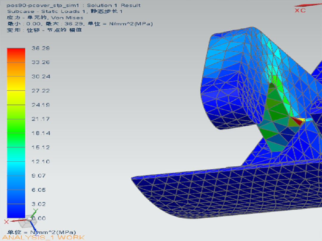 2、受力25N時,塑膠的卡勾根部應(yīng)力比較大,局部達到36Mpa,ABS的抗拉強度最大21-63Mpa,根部R角有一定的撕裂風險;